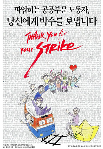 10月10日のハンギョレ新聞には「ストライキをする公共部門の労働者、あなたに拍手を送ります。Thank you for your strike」という全面広告が掲載された。市民団体が6〜7日の2日間、インターネットを通じて膨大な市民の声とカンパを集めて掲載したのだ。