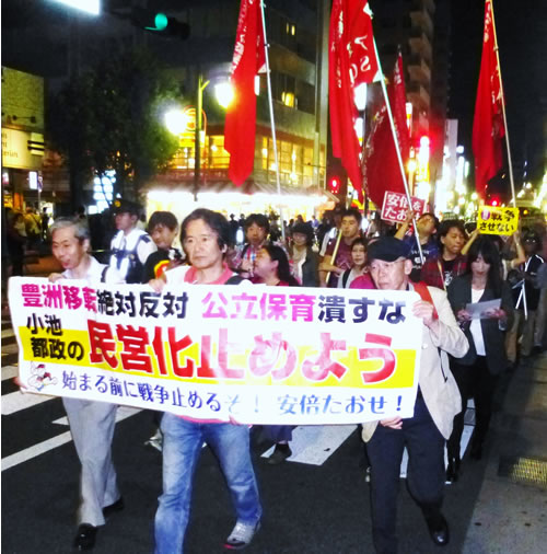 練馬は東京10区(豊島区と練馬区の一部)選出の衆院議員だった小池百合子都知事の地元だ。保育の民営化と闘ってきた自治体労働者、組合を立ち上げ闘う介護労働者が先頭でデモに決起した。