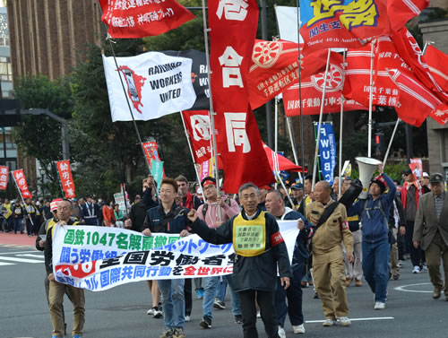 「国際連帯の訴え」では、アメリカの鉄道労働者統一委員会(RWU)のジェームス・ウォリスさんが1人乗務を撤回させた闘いを報告し、ドイツから参加したレイバーネット・ジャーマニーのヘルムート・ヴァイスさんが反戦を訴えた。多数の在日・滞日外国人労働者が登壇し発言した。