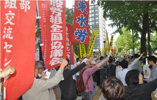 5月25日、全国労働組合交流センターは国会前での抗議行動に立った。衆院厚生労働委での採決強行という緊迫した事態を前に、闘う労働運動を復権させ職場からこの攻撃を覆すという決意に燃えて、行動は展開された。