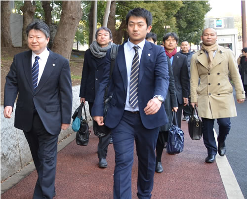 警察の弾圧も許せません。全学連は、一昨年の全学連大会会場前で学生に暴行した公安警察を告訴し、国家賠償請求訴訟も起こしています。大会参加者を公安警察が取り囲み、殴る蹴るの暴挙をはたらきました。全学連は国家権力の暴行を絶対に許しません。昨年も公安警察は弾圧を狙いましたが、大会参加者には一指も触れさせませんでした。今年2月には暴行の証拠を隠す警視庁へ、裁判官と弁護団が証拠保全のために立ち入りました(写真)。労働者・学生の敵=公安警察を解体しよう。