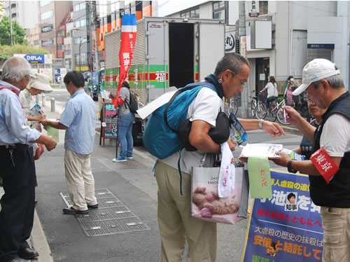 午前9時、動労千葉国際連帯委員会の山本弘行事務局長をはじめ15人がJR両国駅東口、西口、都営地下鉄の出入り口で「追悼文を再び拒否した小池知事を弾劾する」ビラを配布し、「憲法への『自衛隊』明記と『緊急事態』新設に反対します」という新署名を呼びかけた。