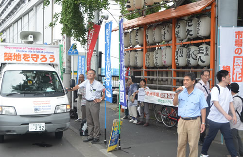 茶屋の労働者は「豊洲では茶屋が廃止され、駐車場も足りず事業者が仕入れもできない。食の安全どころか市場で働く人の健康も危ぶまれる。一致団結して築地ののれんを守ります」と表明。仲卸の村木智義さん(同・原告)は「誰かが犠牲になってからでは遅い。150億円もの赤字が皆さんの血税から出る。決定する権利はわれわれ労働者、納税者にある」と訴えた。90分の街宣は築地の人びとの怒りと結び、実力の反撃が始まったことを示した。