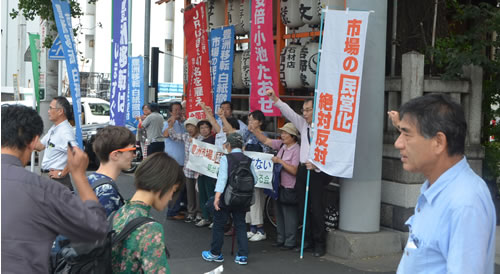 13日午前11時、築地の波除(なみよけ)稲荷神社前で、「築地を活かし豊洲を止める会」が豊洲開場記念式典弾劾の街宣に立った。仲卸や茶屋の仲間が続々と駆けつけ、宣伝カーを使って市場の労働者や買い出し客、観光客に豊洲移転反対を訴えた。地域のユニオンや動労東京などの労働組合、福島からも結集し、築地の仲間とともに小池と闘いぬくと表明した。