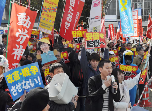 (写真 自民党大会の会場を直撃した昨年3月25日の抗議行動。全国から集まった労働者や学生の先頭でコールする斎藤さんとほらぐちさん【東京・品川区】)
