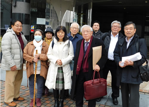 (写真 星野さんの仮釈放を求める新たな要望書1585通を持ち四国地方更正保護委員会に向かう要請団。前列中央が星野暁子さん、その右隣が角田義一弁護士【12月26日 高松市】)