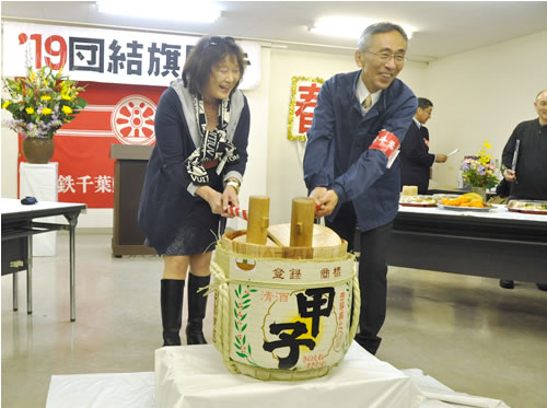 田中委員長と山田佐知子家族会会長が鏡開きをし、永田雅章OB会会長の音頭で乾杯した。動労千葉を支援する会、動労水戸、動労東京をはじめ共闘労組・団体のあいさつが続いた。
