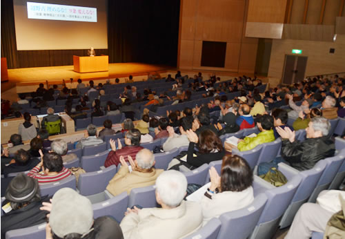 集会の二本目の講演を、「戦争への道を阻むために」と題して弁護士の高山俊吉さんが行った。高山さんは、「戦争を阻止する力は私たち一人ひとりの中にある」と強調し、「排外主義があおられ、『自衛のため』と称して軍備が増強されるのは、現実に戦争が切迫していることのあらわれだ。それを見抜いてみんなに伝えていこう。私たちの訴えは必ず多くの人に伝わる」と力を込めた。