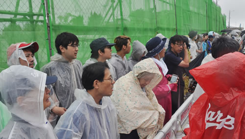 現地は、国道をはさんで南側に基地の正門、北側に現地闘争のテントが立ち並び、対立の構図が見てとれます。朝方からの激しい雨も小雨に変わり、いよいよ座り込みの開始です。