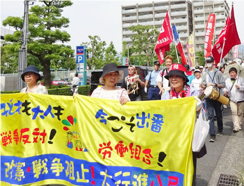 集会後、多くの市民が注目する中、市中心部をデモ行進しました。直前に維新の会・丸山穂高の「戦争で領土を取り返せ」発言があり、安倍政権への人民の怒りと圧倒的に結合し、力強くデモを貫徹しました。労働法制改悪阻止・非正規職撤廃についても訴え、「子どもも大人も戦争反対! 今こそ出番、労働組合!」というデモコールを、見ていた子どもたちも口ずさみ、後を追いかけました。