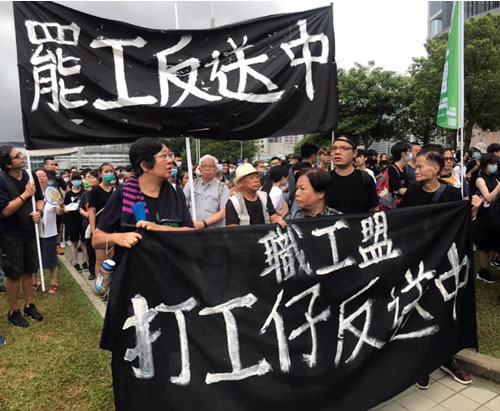 闘いを根底で支えているのが労働組合の決起だ。「香港職工会連盟」は6月17日の全香港ストライキ(労働者のスト、商店の同盟休業、学生の授業ボイコット)を呼びかけ、「香港社会全体の未来のために、ストで集会に参加しよう」「行動を広げ、職場や同業の仲間とともに参加しよう」と訴えた。さらに、「スト参加を理由に不当な扱いや差別を受けたら労組に援助を求めてほしい。労働者が団結して立ち上がりさえすれば、不合理な権利侵害行為に制裁を加えることができる」とし、最後に未組織労働者に向けて「できる限り早く労組に加入しよう」「自らの労組を立ち上げよう」と結んでいる。