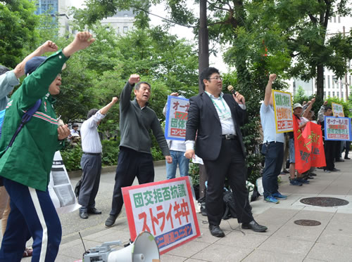 本社前では合同・一般労組全国協議会や動労千葉の仲間も駆けつけ、本部社員も現場の立場に立ち共に声を上げようと呼びかけた。永尾副委員長が「ドラえもん」の替え歌を披露(ひろう)するなど、解放的な雰囲気が本社前を覆った。