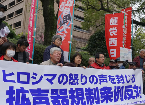 (写真 市役所前での拡声器規制条例反対の座り込み。5回の申し入れを行い、6月27日の記者会見は地元テレビでも大きく報じられた)