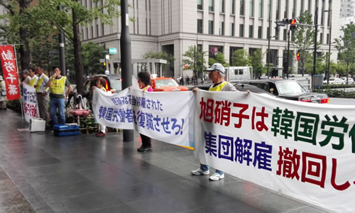 7月16日夕、旭非正規職支会支援共闘会議は動労千葉を先頭に東京・丸の内のAGC本社を訪問、特恵を得て進出した「クミ市でコンプライアンス(法令順守)の義務を果たしているのか」と追及したが総務部・中村は回答拒否。さらに「株主総会で島村社長がAGCファインテクノ韓国がAGCの子会社だと認めたではないか」と詰め寄ったが「お答えする立場にありません」と繰り返すのみで逃げ去った。旭共闘会議は本社前で街頭宣伝をし「解雇の全責任は島村社長にある。解雇撤回し、正規職として職場に戻せ!」と怒りの声を上げた。