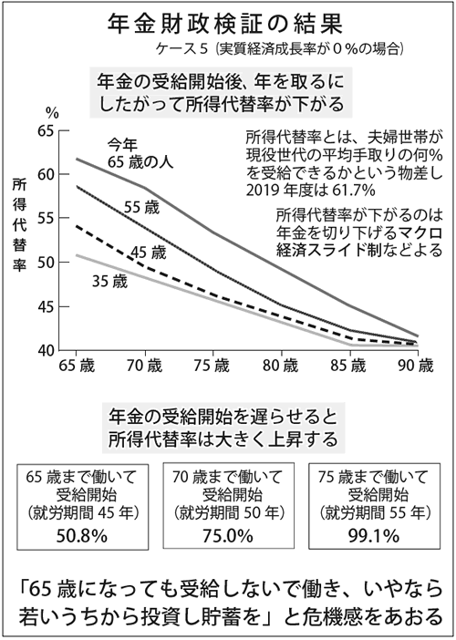 そのうち実質経済成長率を0%に想定した「ケース5」では、今年65歳の世帯の所得代替率は61・7%から45・3%に下がり、35歳の世帯では47・5%から37・6%まで下がる。若い世代ほど公的年金だけで老後を支えることが困難であることを示している。