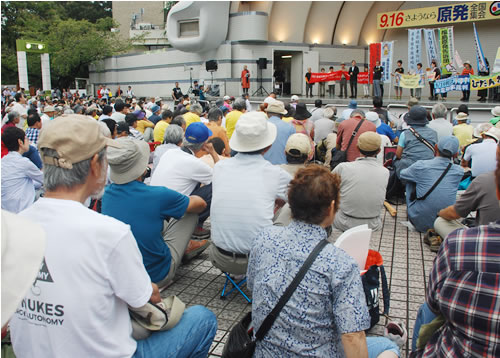 さようなら原発全国集会が9月16日、東京・代々木公園で開催され、労働組合・市民など9千人の怒りに満ちた行動となった。