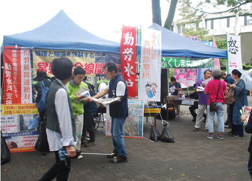 開会前から会場には多くのブースが設置され、動労水戸支援共闘と福島診療所建設委員会のブース(写真中)には多くの人が訪れ、署名への協力や実りある交歓が行われた。