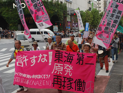 集会後、参加者は渋谷・原宿のコースに分かれデモ行進。にぎやかなNAZENのデモ(写真下)はひときわ注目の的となった。