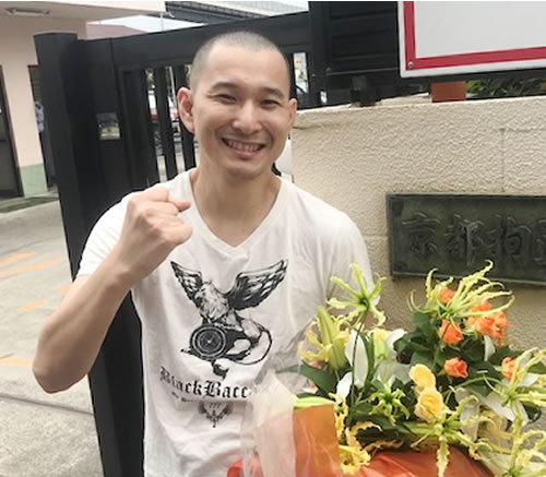 (写真 斎藤さんが元気に保釈【9月27日 京都拘置所前】)