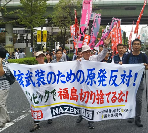 「関電・高浜町・原発建設会社間での原発利権サイクルが暴かれた。日帝の原発政策の末路だ。原発再稼働・フクシマ圧殺は安倍政権による戦争・改憲・核武装のための攻撃だ。NAZENこそが改憲・戦争阻止!大行進運動の先頭に立とう」「松井大阪市長の『汚染水受け入れ・大阪湾放出』発言は断じて許しがたい。関西におけるフクシマ圧殺攻撃との闘いの課題になる。ヒロシマ・ナガサキの怒りもあり独自の核武装ができずにきた日帝が『核の平和利用』の名目で原発を推進してきたのが日本の核政策。それが福島原発事故で破綻した。追い詰められているのは安倍だ。全日建運輸連帯労組関西地区生コン支部への弾圧との対決の中で開催される11・3全国労働者総決起集会に総結集しよう」