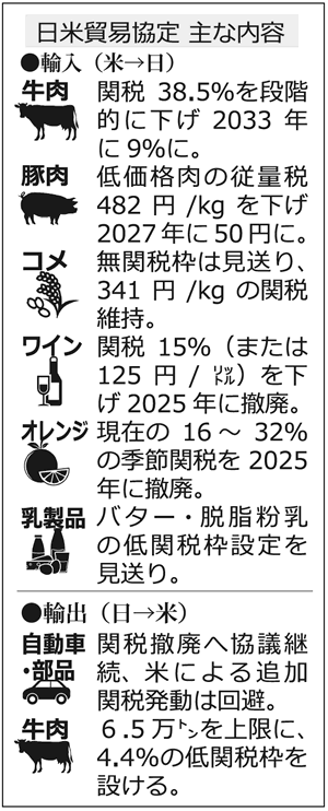 農産物への「TPP(環太平洋経済連携協定)水準」の関税が成果とされているが、「TPP水準」によって農産物輸入が加速され、日本農業に壊滅的な打撃を与える。とりわけ、牛肉・豚肉、果樹農家への打撃は計り知れない。(TPP水準とは、牛肉は38・5%の関税を9%に引き下げ、豚肉は4・3%がゼロに、オレンジは16%〜32%がゼロである。)