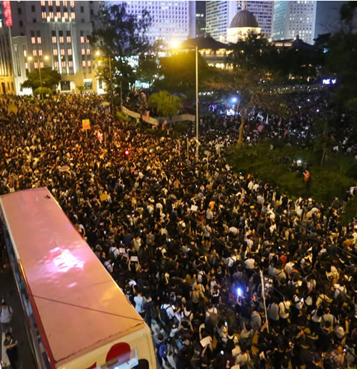 12日のデモは全体で1万人以上が参加した。13日も、警察の激しい弾圧と対決して、労働者・学生が立ち上がった。デモ隊は各地でゲリラ的に行動を起こして警察・機動隊を翻弄(ほんろう)した。「覆面無罪、法案無理」「香港解放、今革命を」などと叫んでデモをした。さらに香港の主要なショッピングモールでの不買運動も呼びかけられている。