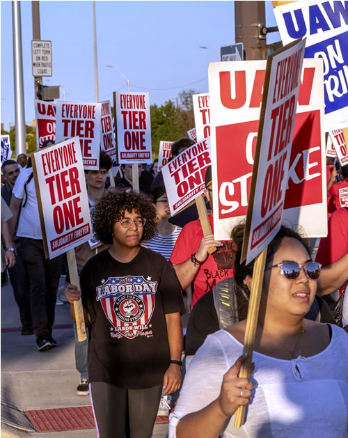 UAW本部が掲げているのは形だけの賃上げ要求だが、現場では「二層制度反対」「すべての労働者を第一層へ」が前面に掲げられている。「同じ職場に時給が半分の労働者がいる。私たちを敵だと思っている人もいる。こんな職場で働きたくない」などの声が上がっている。賃上げ要求も、積年の怒りの爆発だ。