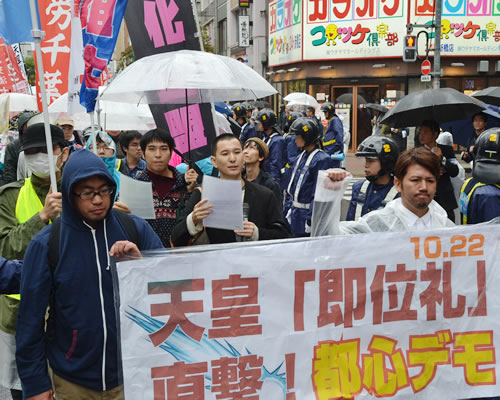 (写真 10月22日、全学連を先頭に、都心で天皇即位儀式弾劾デモ)