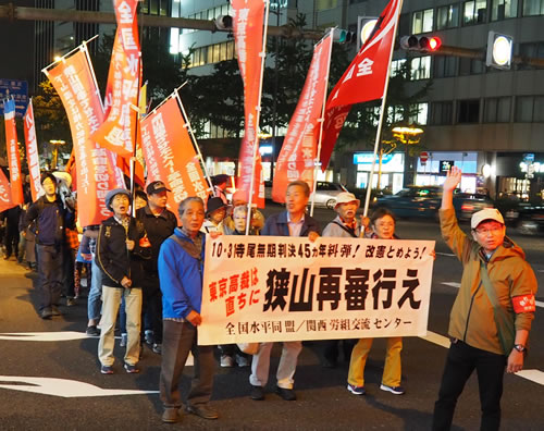 全関西狭山闘争は10月30日、大阪中之島駅前広場に100人が結集し、大阪駅前までのデモをかちとった。狭山闘争への決起と11・3労働者集会、11・16関西生コン支部弾圧粉砕闘争を呼びかけるコールが大阪市内に響き渡った。