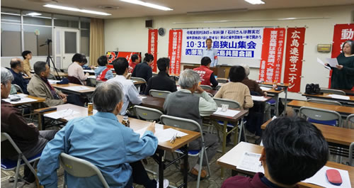 広島狭山集会は10月31日、部落解放広島共闘会議の主催で広島市西区福島町の西地域交流センターで開かれ、労働者・学生30人が参加しました(写真)。