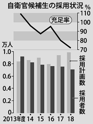 自衛官候補生試験の応募者数で見ると、13年の3万3534人に対し17年は2万7510人に激減。18年度には、防衛省の採用計画数9882人に対し、実際に採用できた人数は7075人(19年3月末現在)で計画の7割程度にとどまった。陸海空ともに5年連続で計画を下回るという異常事態だ(図)。特に安保戦争法で米艦防護などの任務が大幅に拡大される海自は、計画の59・9%しか採用できなかった。