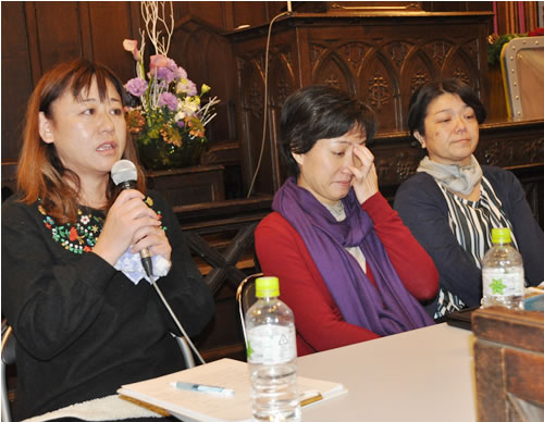 (写真 上京した「チーム緑ケ丘1207」の母親3人が涙ながらに政府要請行動の経過を報告し、「力を貸してください」と訴えた【12月7日 東京・文京区】)