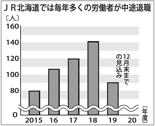 若手の大量退職も大問題になっている。JR北海道はJR各社の中で給与は最低、北海道全域の異動もある。その上、会社に将来の展望がなく、廃線問題で周囲の視線は冷たい。18年度の中途退職者は141人、その前の2年間も100人超が退職した。毎年の新規採用270人の半分が辞めてしまうのだ。19年度は過去最高の中途退社が不可避と言われる。