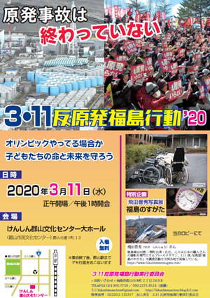 原発事故は終わっていない3・11反原発福島行動20―オリンピックやってる場合か、子どもたちの命と未来を守ろう/3月11日(水)午後1時開会(正午開場)/けんしん郡山文化センター大ホール(郡山市民文化センター、福島県郡山市堤下町1―2)/集会終了後、郡山駅までデモ行進/3・11反原発福島行動実行委員会