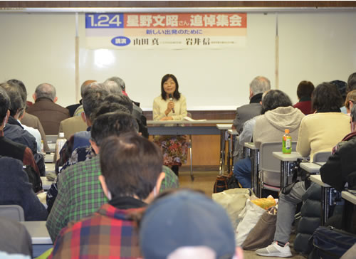 司会の東京連絡会の青年労働者が1月14日に逝去した星野再審弁護団長・鈴木達夫弁護士の遺志を継ぎ、「星野運動の新しいスタートとして、国賠闘争の展望を開こう」と開会を宣言。