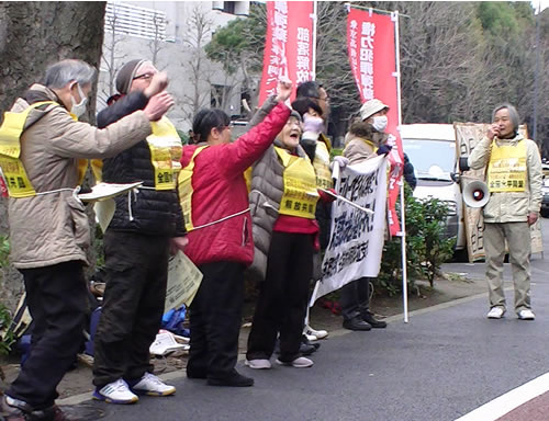 正午、高裁前に登場した全国水平同盟杉並支部と部落解放東日本共闘会議の仲間は、寒風を突いて情宣活動を行った。街頭には安倍の「うそ・隠ぺい・隠滅」への怒りがあふれ、道行く人々は「(有罪証拠とされた)被害者の万年筆は偽物」というビラに敏感に反応して次々と受け取り、署名に応じてくれた。