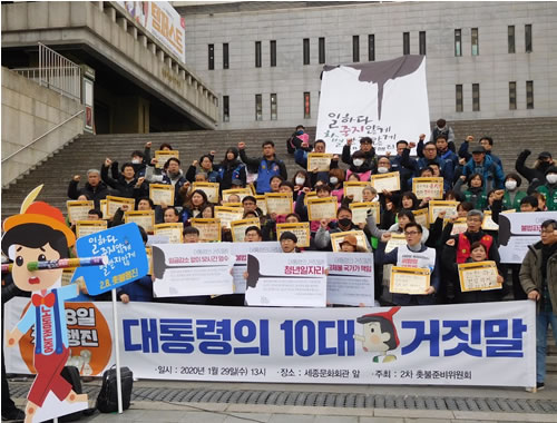 参加者は「公共部門非正規職ゼロ時代」をはじめとするムンジェイン大統領の10大ウソを暴く「ピノキオ」パフォーマンスを行い、「この時代のチョンテイルの50大要求」として、非正規職撤廃・直接雇用などを求めて声を上げた。