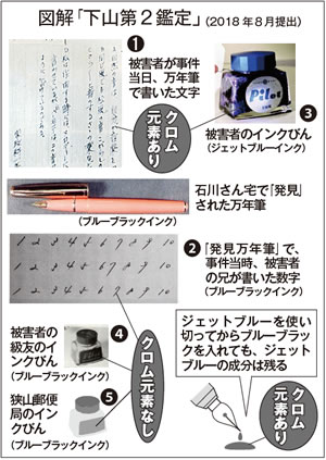 その結果、「発見万年筆」のブルーブラックインクは鉄元素を含みクロム元素は含まず、被害者の万年筆のライトブルーインク(商品名はジェットブルーインク)はクロム元素を含み鉄元素は含まなかった。(ジェットブルーインクの成分元素はその後変化)