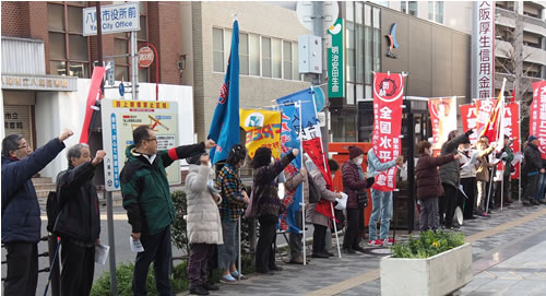 市役所闘争には、全力で立った八尾北労組の執行委員を先頭に、地域の仲間、高槻・京都の全国水平同盟の仲間、関西労組交流センターの労働者が総決起した。8家族は八尾市住宅管理課を弾劾し、抗議文をつきつけた。八尾北労組は「これこそ改憲・戦争攻撃そのものだ。自治体労働者は一緒に闘おう」と呼びかけた。