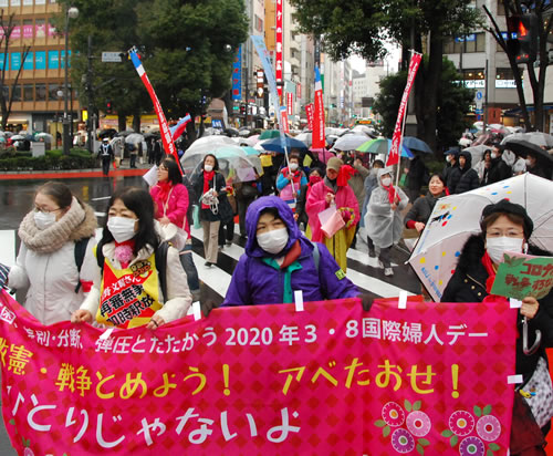 2020年3・8国際婦人デー行動が、東京を始め、宮城、大阪、広島(以上8日)、福岡(7日)で一斉に取り組まれた(詳報次号)。東京では、雨をついて「コロナを使ってオリンピックするな!」「国を守るな、命を守れ!」と元気なコールが池袋の繁華街に響き渡った。コロナ問題を使って「休校」「自粛」を強制する安倍政権への怒りが道行く人々の熱い共感を巻き起こした