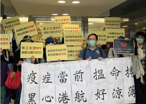 解雇攻撃に怒る香港航空の労働者は3月3日、ランタオ島の東涌(トンチョン)にある香港航空の本部事務所に対する抗議行動に立ち上がった。「疫病拡大では命を危険にさらして闘ったのに、腹黒い会社は非情だ」との横断幕を掲げ、団体交渉を要求した。