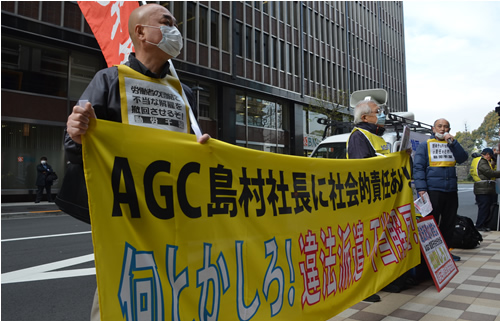 群馬合同労組、合同労組かながわ、東京各地の合同労組・ユニオンなど30人での行動となった。動労千葉の佐藤正和さん、中村仁さんも参加し、労働者の国際連帯で解雇撤回まで闘う決意を語ると共に、非正規職労働者を切り捨てるAGC資本を弾劾し、本社の責任で解雇撤回・直接雇用を行えと訴えた。