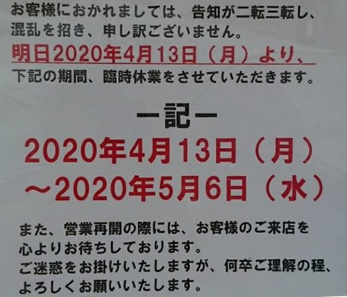 この店舗オーナーは、緊急事態宣言を受けて、臨時休業したいと本部に申し出、いったんは「やむを得ない」との了解を得て、4月10日から休業に入るつもりで張り紙や配送中止などを手配していたところ、10日になって本部は営業継続を強要。11、12日は「オーナーヘルプ」も使って営業したが、これ以上は無理と判断し、「コンビニ関連ユニオンに相談している。メディアにも明らかにする」とつきつけた。そうしたら本部が折れて、13日夕方には休業同意書にサインし、本部了解の下、臨時休業に突入した(写真)。