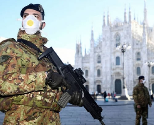 (写真 イタリアでは、銃を構えた軍警察の兵士が街頭に立って検問を行っている【ミラノ大聖堂前】)
