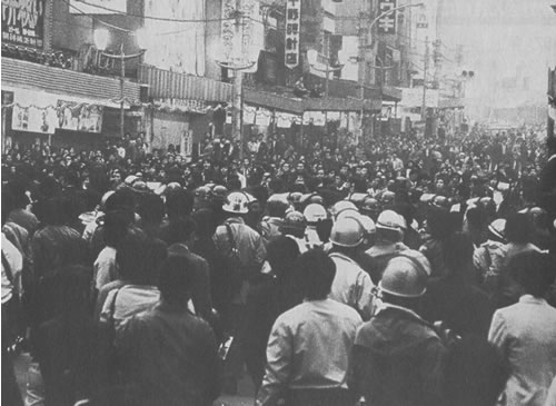 大坂正明同志が参加した、星野文昭同志をリーダーとするデモ隊は、こうした激突を経て渋谷に集まった万余の民衆と合流し、深夜まで闘いぬいた。