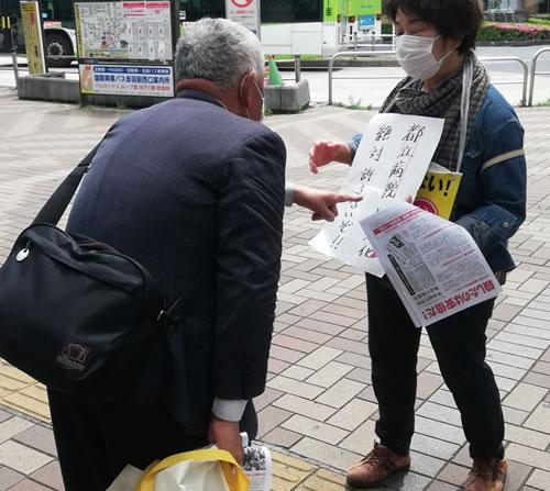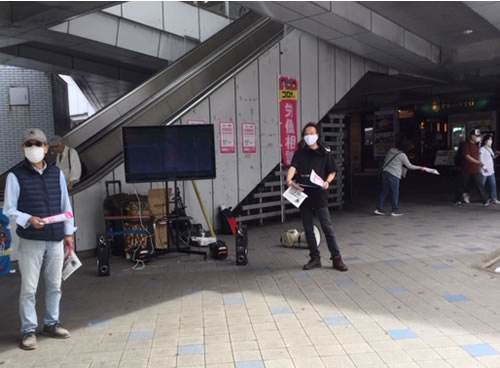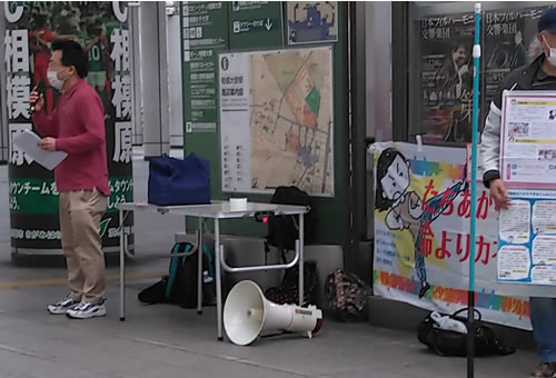 湘北合同労組、婦人民主クラブ全国協・相模原支部、改憲・戦争阻止!大行進湘北連絡会が呼びかけた相模大野駅前での宣伝は、労働相談のリーフレットとビラの受け取りがよく、「家族・友人に解雇された人はいませんか? 生き抜くために休業補償は100%要求しよう」の訴えに、戻ってきてビラを受け取る人もいた。(写真中)