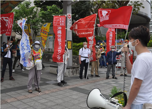 5月16日、那覇市の沖縄県青年会館で「『復帰』48年・沖縄戦75年5・16沖縄集会」が開催された(主催/改憲・戦争阻止!大行進 沖縄、共催/国鉄闘争全国運動・沖縄)。沖縄と全国から50人が結集し、集会前の国際通りデモとあわせて「辺野古阻止・基地撤去、沖縄の怒りで安倍たおせ」を掲げた5・15闘争を緊急事態宣言下で闘った。