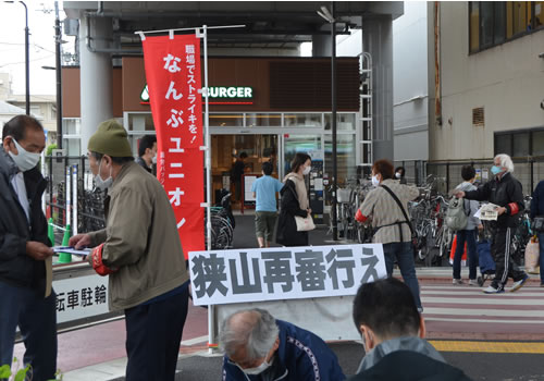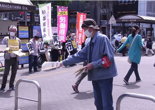 JR阿佐ケ谷駅南口では全国水平同盟杉並支部が呼びかけ狭山スタンディングアピールが行われました。東京西部ユニオン、多摩連帯ユニオンの仲間も駆けつけました。訴えに立ち止まって聞き入る市民、チラシを見て討論する輪がいくつも生まれました。逮捕時24歳の石川さんが81歳になると知り、「悔しいですね」と署名に応じる青年も。400枚のチラシが配られ、狭山署名は13筆に。「コロナ関連労働相談」ののぼりを見た労働者が不当解雇を訴え、即日ユニオンに加盟、解雇撤回へ闘うことになりました。 (K)