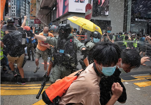 こうした弾圧の嵐の中でも、続々とデモ参加者が出発点のビクトリアパークに集まってくる。このデモはコロナ対策を口実に申請が却下された無許可デモだ。だが国安法成立への怒りから、多くの労働者民衆が実力デモに必死の思いで駆けつけた。午後2時50分過ぎ、集まった労働者民衆はデモに出発し、全車道を占拠して進んだ。途中からも人々が次々と合流してくる。警察はあちこちで道路を封鎖し、集まる民衆に放水し、催涙スプレーを噴射し、軍事用でもある新型の拳銃発射式コショウ弾などを乱射した。デモ隊も各地で道路を封鎖し、バリケードを築き、警察と対決しながらデモを闘いぬいた。