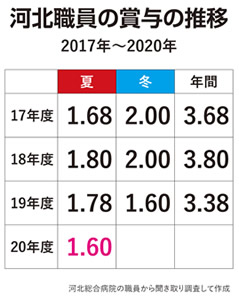 10月6日の決算委員会でこの問題を再度取り上げ、「河北病院職員の賞与の推移」のボード(表)を作成し、区の答弁がいかに無責任でデタラメかを追及しました。「減収補塡」の名目で投入された税金23億円は、マスクや消毒器具などコロナ感染予防対策費として使われたのか? 病院の施設整備に使われたのか?それとも病院資本の内部留保へと回ったのか?